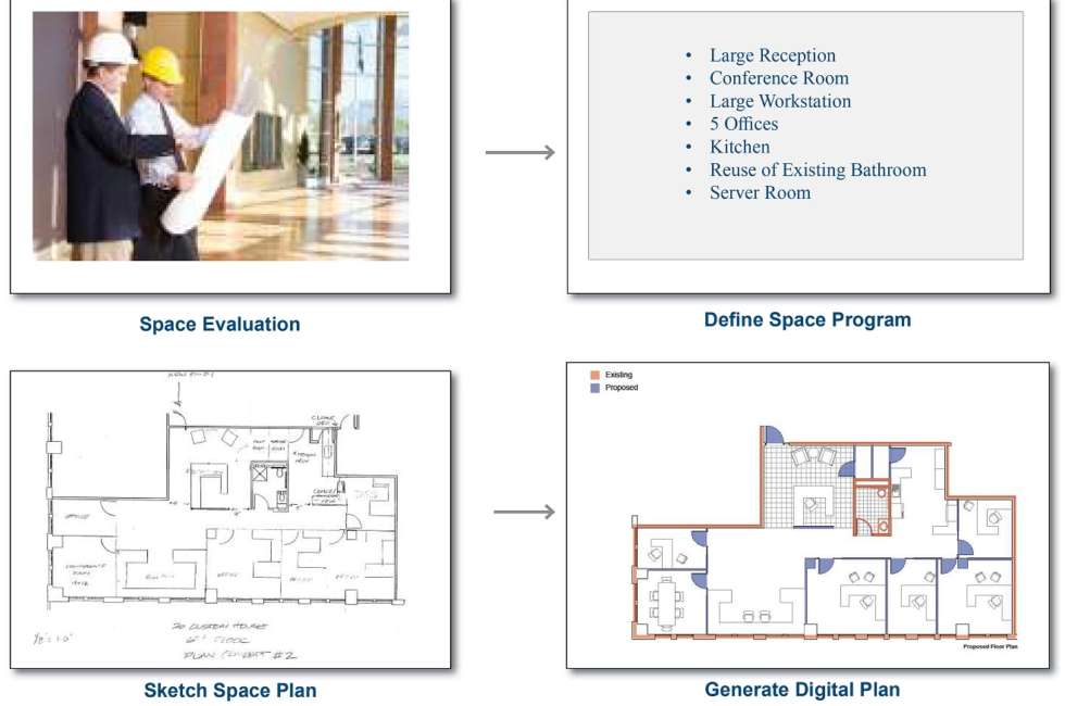 Please review our “Feasibility-Snapshot“(click on) that illustrates and explains our approach. This unmatched professional service is offered at no charge as appreciation for the opportunity to prove our value as a partner. The analytics of our cost model is highly refined and based on our reliable historical cost data which is adjusted for market conditions and the particulars of the perspective tenants design program. Finally, we prioritize providing budget feedback in an extremely expeditious manner which in most cases is within 24 hours after getting the design program and being able to investigate the existing conditions.