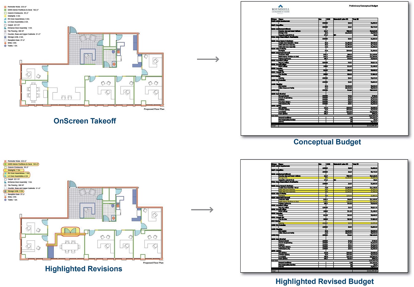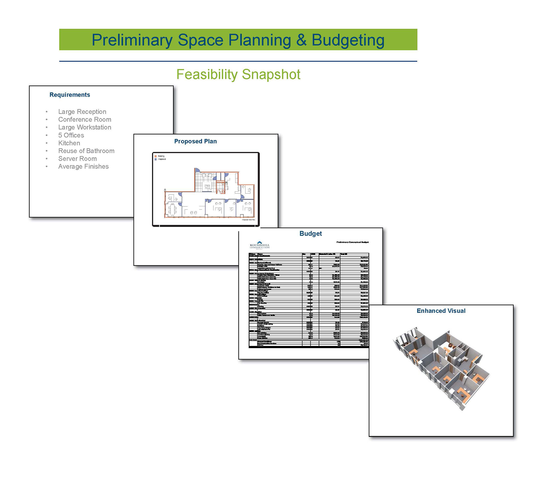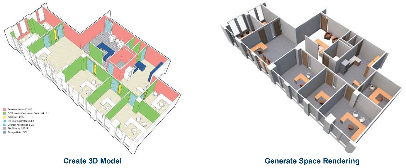 Please review our “Feasibility-Snapshot“(click on) that illustrates and explains our approach. This unmatched professional service is offered at no charge as appreciation for the opportunity to prove our value as a partner. The analytics of our cost model is highly refined and based on our reliable historical cost data which is adjusted for market conditions and the particulars of the perspective tenants design program. Finally, we prioritize providing budget feedback in an extremely expeditious manner which in most cases is within 24 hours after getting the design program and being able to investigate the existing conditions.